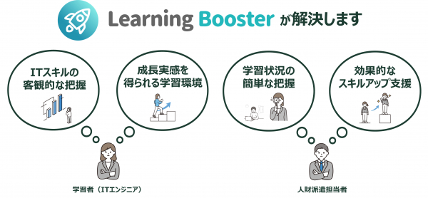 このような状況を背景に、JTPでは“成長を加速する学びのオールインワンプラットフォーム”である「Learning Booster」を提供し、人材派遣会社におけるITエンジニア育成を支援しています。