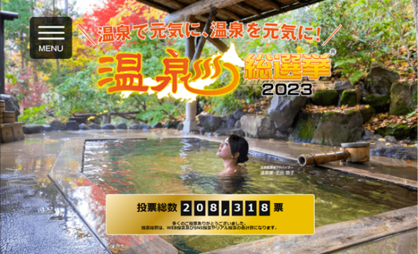 「温泉総選挙2023」では、全国の温泉地が9つの部門から1部門を選択してエントリーし、選挙を通じて温泉地の魅力を広くPRしました。今年度はWeb投票及びSNS投票とリアル投票を実施し、2023 年7月26 日(水)~2023 年10 月26 日(木)までの期間で、20万8,318の応援投票がありました。