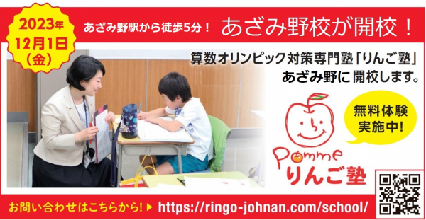 株式会社城南進学研究社(本社:神奈川県川崎市、代表取締役社長CEO:下村勝己、以下「当社」)が運営する算数塾「りんご塾」は、2023年12月1日(金)、神奈川県横浜市にあざみ野校を開校します。