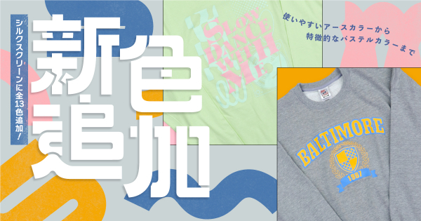 新色には、ホワイトやブラック、ベージュなどの定番の生地色と相性抜群のアースカラーから、デザインを明るい印象に変えてくれるパステルカラーまでを追加しました。より充実したカラーラインナップで、デザインの幅が広がったシルクスクリーンプリントをぜひこの機会にご利用ください。
