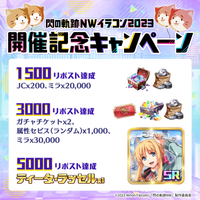 RT(リポスト)数に達成すれば、JC、ガチャチケット、属性セピス(ランダム)、さらに、軌跡シリーズの人気キャラクターSR『ティータ・ラッセル』を入手できるチャンスです!