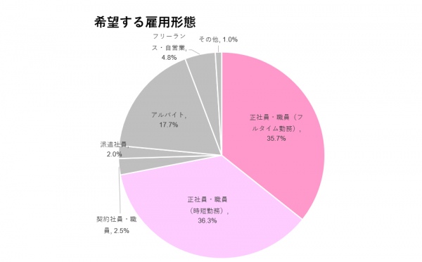 調査結果から、妊娠中・子育て中のママの中で就職や転職の意向がある人は約41%、希望の雇用形態は正社員(職員)が約72%と、キャリアに対して意欲的なママが多いことがわかった。また、産休・育休中に自己啓発サービスを利用している人は約20%、興味のある自己啓発はofficeスキルなどのPC操作、英語系スキル、食事関連などが上位に入った。