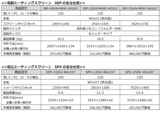 ■幕面のサイズは100、120、150インチを用意。