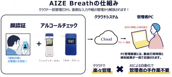 これまで、トリプルアイズはAI顔認証によるアルコール検知システム「AIZE Breath」を提供してまいりました。AIZE Breathは、AI顔認証とアルコールチェックを一連の動作で行い、記録をクラウドに自動保存するシステムです。安全管理者のPC管理画面には、打刻時間と検知結果が一括で記録されます。また、既存の勤怠システムとの連携や運転日報の記入も可能です。顔認証によりなりすましを防ぎ、かつ運転者と管理者の業務工数を大幅に削減するシステムとして高い評価を受けています。