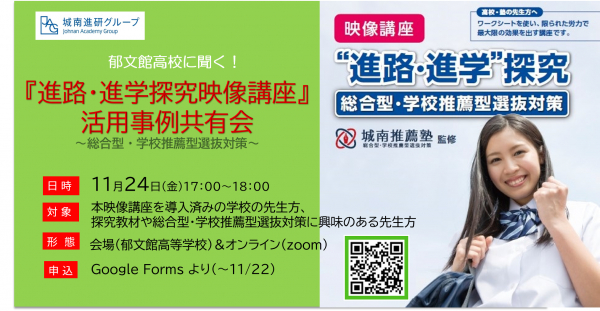 株式会社城南進学研究社(本社:神奈川県川崎市、代表取締役社長CEO:下村 勝己、以下「当社」)は、2023年11月24日(金)、当社が開発した「進路・進学探究映像講座(総合型・学校推薦型選抜対策)」の活用事例共有会を、私立郁文館高等学校(東京都文京区)にて開催します。