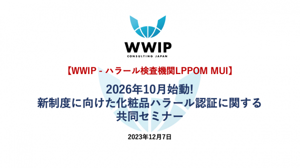 株式会社ワールドワイド・アイピー・コンサルティングジャパン (以下「WWIP」) は、2023年12月7日(木)15:30~17:30に、「【WWIP - ハラール認証機関LPPOM MUI】 2026年10月始動! 新制度に向けた化粧品ハラール認証に関する共同セミナー」を開催いたします。(HP:https://wwip.co.jp/seminar20231207LPPOM-WWIP/)