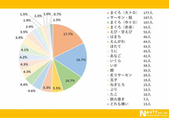 「次の中で一番好きな寿司ネタはなんですか?」という質問については、「まぐろ(大トロ)」が17.7%、「サーモン・鮭」が16.7%、「まぐろ(中トロ)」が10.7%という結果になり、トップ3にまぐろが2つランクインしました。