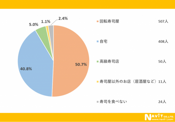 普段お寿司を食べる場所については、「回転寿司屋」が50.7%、「自宅」が40.8%、「高級寿司店」が5.0%という順になりました。