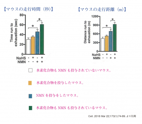 NMNを投与された32月齢(人間の年齢で85歳程度)のマウスでは、投与されていないマウスと比較してトレッドミルでの走行距離と時間が1.6倍伸び、さらに水素化合物を同時投与した高齢マウスにおいては、走行距離と時間が2倍になったことが報告されています。(下記グラフ参照)