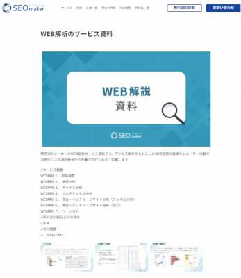 東京SEOメーカーのWEB解析サービス資料です。アクセス解析をもとにしたWEB施策の最適化とユーザー行動の可視化による課題発見から改善点の打ち手をご提案します。