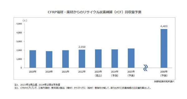 株式会社矢野経済研究所(代表取締役社長:水越 孝)は、リサイクル炭素繊維世界市場を調査し、参入企業の動向、将来展望を明らかにした。ここでは、リサイクル炭素繊維(rCF)回収量の予測について、公表する。
