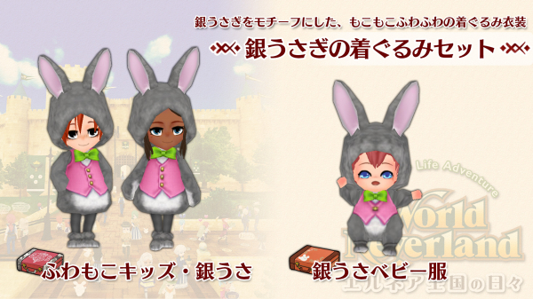 株式会社アルティ(本社:福岡県福岡市、代表取締役:宮崎慈彦)は、箱庭ライフシミュレーションゲーム『ワールドネバーランド エルネア王国の日々』Nintendo Switch版の新規追加コンテンツ『銀うさぎの着ぐるみセット』を11月16日(木)からニンテンドーeショップでダウンロード配信します。