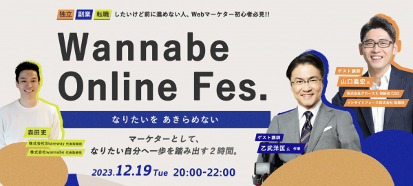 Webマーケターと企業をつなぐ案件マッチングプラットフォーム『Wannabe Work(ワナビーワーク)』を運営する株式会社Shareway(シェアウェイ)(東京都杉並区:代表取締役 森田吏)は、作家の乙武洋匡氏、株式会社グロースX 取締役 COO/インサイトフォース株式会社 取締役 山口義宏氏らを特別講師に迎え、マーケターとして、なりたい自分へ一歩を踏み出すためのオンラインイベント『Wannabe Online Fes(ワナビーオンラインフェス)』(https://wannabe-fes.com/)を2023年12月19日(火)20時より開催いたします。