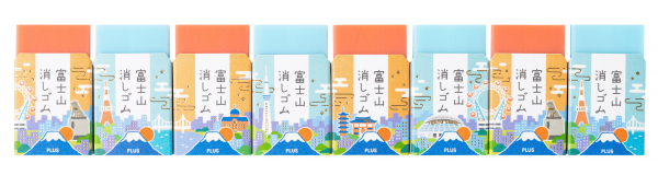 東京の観光スポットをレイアウトした6柄の消しゴムケースを採用しました。消しゴム本体の樹脂は、それぞれ富士山の向こうに広がる昼間の空と夕方の空をイメージした「空富士」と「茜富士」の2色セットで、ケースに入っています。また消しゴムケースは、横に並べると絵柄がつながりループします。ついコンプリートしたくなる楽しいデザインです。