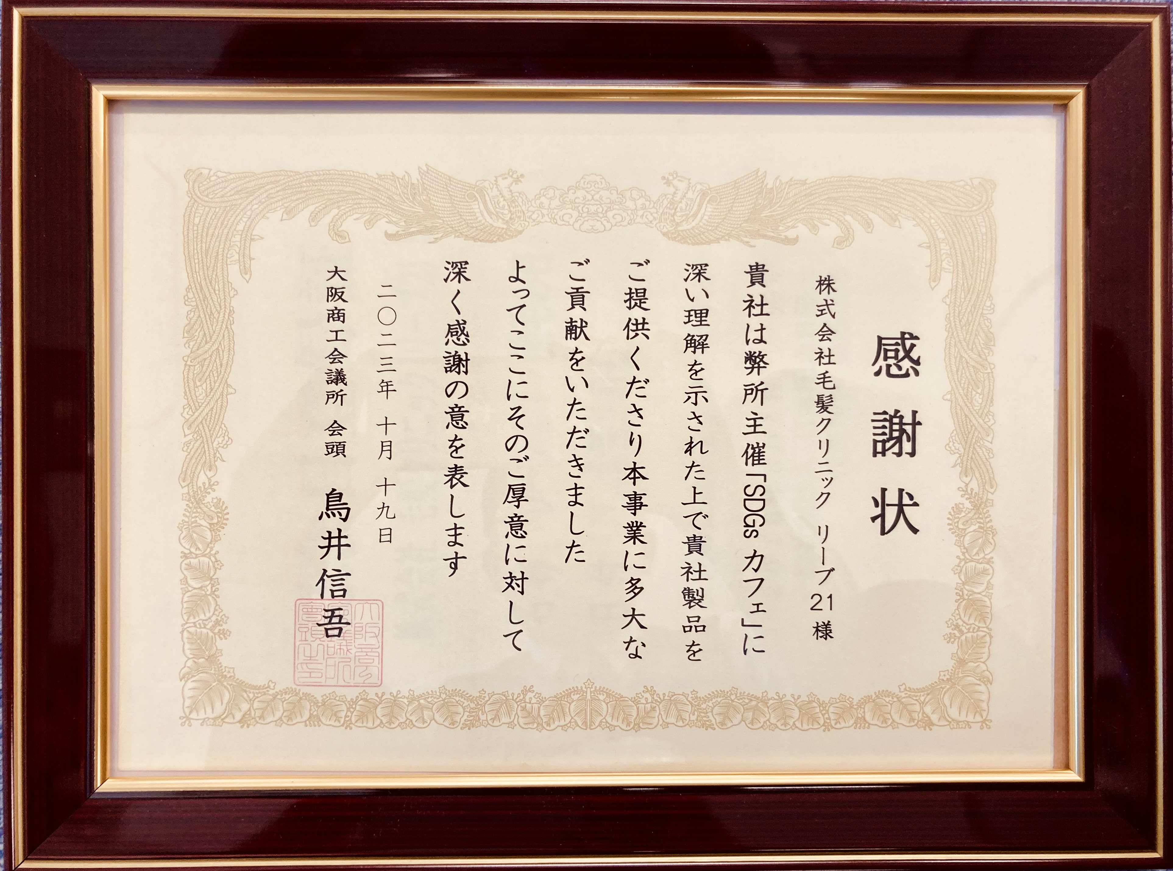 正真正銘自分の髪 リーブ21(本社:大阪市中央区、代表取締役社長:岡村勝正、以下「リーブ21」)は、2023年10月18日(水)、19日(木)大阪商工会議所が主催した「SDGsカフェ」に、カーボンニュートラルに貢献する植物「モリンガ」の鉢植えを提供したことに対して感謝状をいただきました。