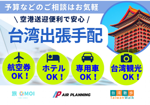 株式会社AIR PLANNINGは(本社:東京都千代田平河町1-3-6 BIZMARKS麴町2F 公式サイト www.air-planning.co.jp )自社運営中の台湾専門予約サイト「旅OMOI」https://www.tabi-omoi.com/ に、新たなサービスとして、「台湾出張手配安心サポート」https://www.tabi-omoi.com/businesstaiwan を11月15日から提供開始しました!