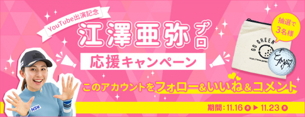 株式会社ゴルフ・ドゥ(本社 さいたま市 代表取締役社長:佐久間功 以下、当社)の運営する公式Instagram「【公式】ゴルフドゥ!(以下、公式Instagram)」にて、江澤亜弥プロのサイン入りボールが3名様に当たる「江澤亜弥プロ応援キャンペーン(以下、本キャンペーン)」を実施します。応募期間は2023年11月16日(木)から2023年11月23日(木)の1週間です。