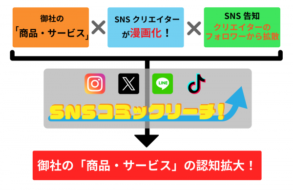 そんな企業様に向けてSNSの人気クリエイターが企業様の「商品・サービス」を分かり易く「マンガコンテンツ化」更に「SNS上での投稿・拡散」もお手伝いします。