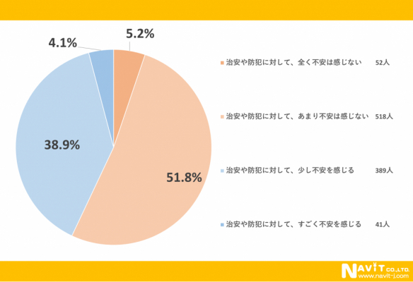 1番多かった回答が「防犯に対して、あまり不安は感じない」で51.8%と過半数になりました。日本の治安の良さが伺える回答だと思います。「治安や防犯に対して、全く不安は感じない」という方も5.2%いらっしゃいました。