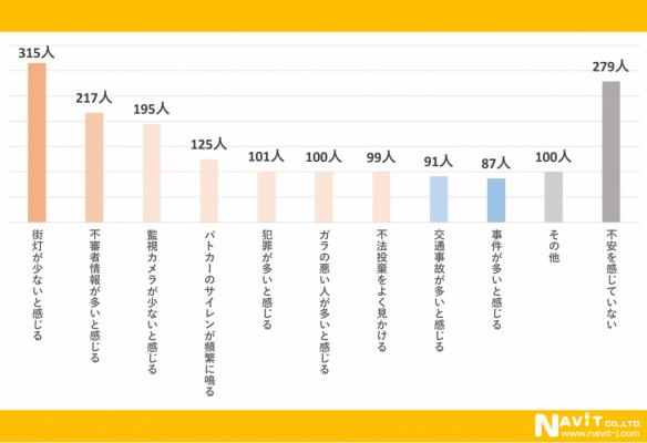 このアンケートは複数回答にていただいています。「街灯が少ないと感じる」という方が最も多く315人となっています。街の灯りが少ないと不安感が増しますね。次に多かったのは「不審者情報が多いと感じる」という回答で217人す。こちらは、ダイレクトに不安を感じる要素になります。