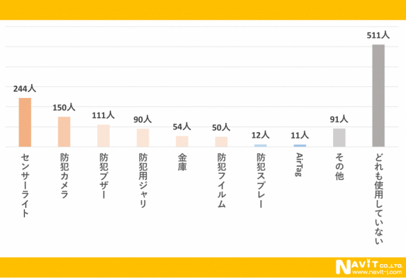 こちらのアンケートも複数回答でいただいています。最も使用されている防犯グッズは「センサーライト」で244人となっています。次に多かったのは「防犯カメラ」で150人です。最近は簡単な防犯カメラなら低コスト化してきているので導入しやすくなったのが理由の一つでしょう。次に「防犯ブザー」が111人と続いています。