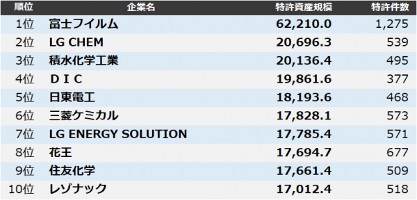 集計の結果、1位 富士フイルム、2位 LG CHEM、3位 積水化学工業となりました。