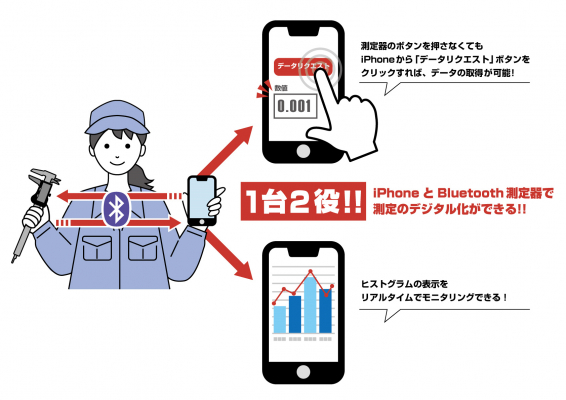 従来の「SmartMeasure(R) for iPhone」では、Bluetooth 測定器の送信ボタンを押さないと端末に測定データを取り込むことができませんでした。今回追加された「データリクエスト機能」によって、Bluetooth 測定器の送信ボタンに触れることなく、 iPhone/iPad 上の操作だけで任意のタイミングで測定値を要求し、安定した測定値を手軽に取得が出来るようになりました。これにより、作業時間の短縮が可能となり、そして業務負担の削減に貢献します。