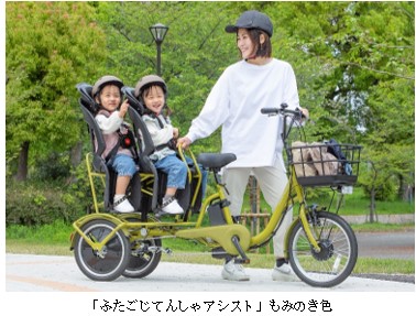 「ふたごじてんしゃ」は、未就学の双子や年子の幼児2人を乗せて公道を走ることができる、日本初で唯一のBAA(※2)の認定を受けた幼児2人同乗用三輪自転車です。発案者であり自身も双子ママの中原美智子さん(※3)との出会いから、多胎育児では外出や移動が困難でひきこもりになるケースも多く、気軽に外出したいという切実な願いを知り、827人の双子ママ・パパの要望を取り入れて当社が開発しました。2018年の発売以来、多くの双子家庭で活用されていますが、発売時より電動アシスト付きへの要望も数多く寄せられました。