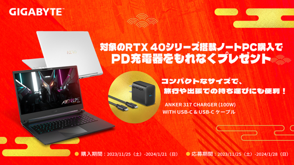 2023年11月24日 - GIGABYTE Technology Co., Ltd. 台湾・新北市 - コンピュータテクノロジーで世界をリードするGIGABYTE Technologyは、2023年11月25日~2024年1月21日の期間中、NVIDIA GeForce RTX 40シリーズ搭載のゲーミングノートPC「AORUSシリーズ」またはクリエイター向けノートPC「AERO 16 OLEDシリーズ」をご購入いただいたユーザーに、Anker JapanのUSB PD対応急速充電器「Anker 317 Charger (100W) with USB-C & USB-C ケーブル」をもれなくプレゼントする「年末年始大感謝祭プレゼントキャンペーン」を実施いたします。