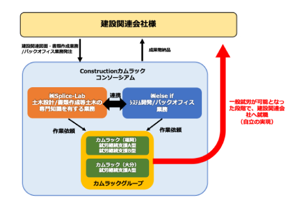カムラックグループ((株)カムラック 本社:福岡市博多区千代、代表取締役:賀村研)と(株)とSplice-Lab(本社:福岡市博多区住吉、代表取締役:片山英資)と(株)else if(本社:福岡市博多区千代、代表取締役:髙森啓二)は、建設業界が抱える課題である人員の高齢化や人手不足、更には2024年4月1日以降、時間外労働の上限を厳守しなければいけない状況に対して、障がい者就労支援事業所とのコラボによる課題解決を図る。