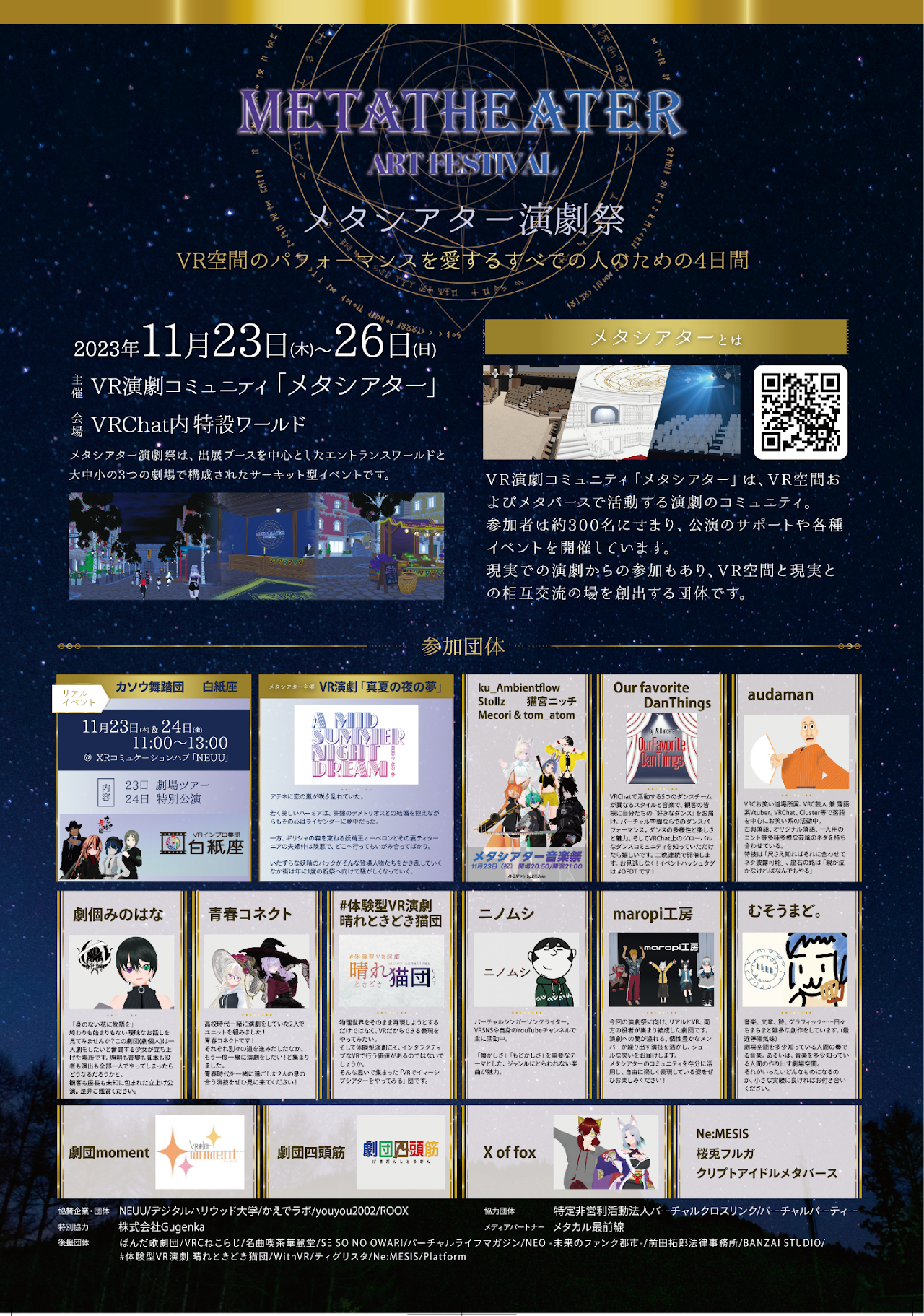 「メタシアター」はVR空間やメタバースで活動する演劇コミュニティです。参加者は200名を超え、公演のサポートや各種イベント開催を通じて活動を展開しています。「メタシアター演劇祭」は、同コミュニティがVRChat上で開催する、世界初のバーチャル演劇祭。3つの劇場が用意され、15の出演団体が、のべ28のパフォーマンスを4日にわたって展開します。