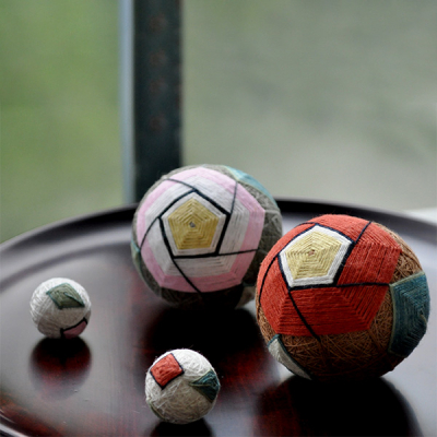 昔、日本各地で作られていた手まり。元々は武家の奥女中が姫君の玩具に色鮮やかな絹糸を使い、複雑な幾何学模様をかがったものがいつしか庶民にも広まったものだそうです。木綿、塩、砂糖の「讃岐三白」でその名を知られた讃岐地方のかがり手まりは木綿の糸を自然の草木を使って染めた素朴で優しい色合いが特徴です。