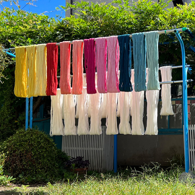 古い木造の幼稚園跡地を利用した工房では、木綿の糸を草木染して彩り豊かにかがり糸を揃え、つくり手たちは色合わせに工夫を凝らしながら、日々、腕を磨いています。