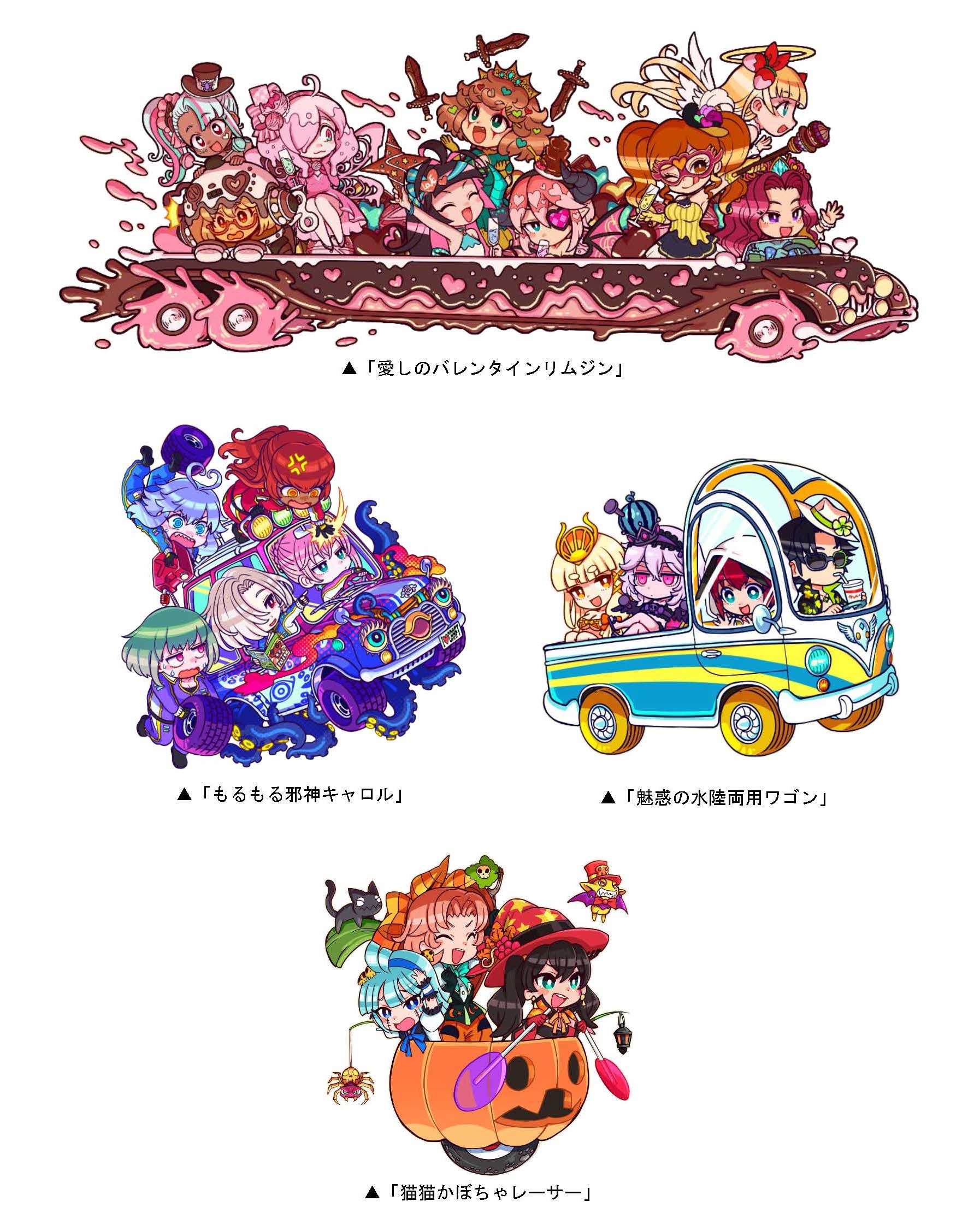 本ダンジョンには、「愛しのバレンタインリムジン」「もるもる邪神キャロル」「魅惑の水陸両用ワゴン」「猫猫かぼちゃレーサー」が新たに出現します。また、クリアした際に手に入る「オーバーテイクP」を貯めると、DRAレア「猫猫かぼちゃレーサー」などと交換できます。