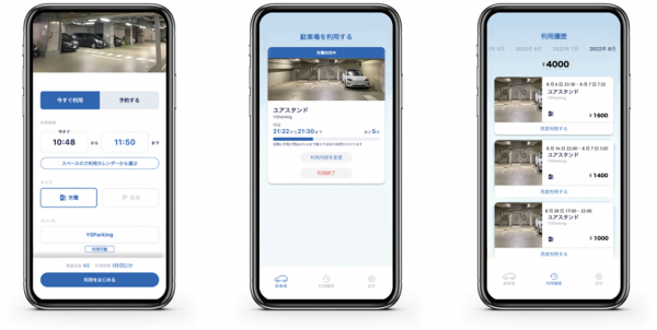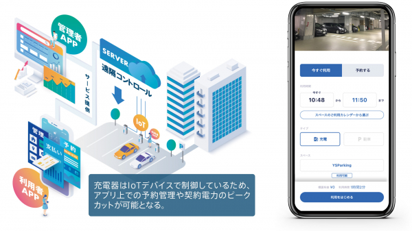 充電器を利用する際は専用アプリでお持ちのスマホから利用予約&決済が可能。また、管理者さま向けに利用明細の確認や各種設定がおこなえる画面も用意。