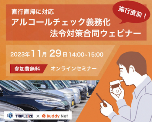 2023年11月29日(水)、AI顔認証によるアルコール検知システム「AIZE Breath」(https://aizebreath.jp/)を提供する株式会社トリプルアイズ(本社:東京都千代田区、代表取締役:山田 雄一郎、東京証券取引所グロース市場《証券コード:5026》、以下トリプルアイズ)と24時間365日の有人アルコールチェック代行サービス(https://www.buddynet.jp/contactcenter)を提供する 株式会社バディネット(本社:東京都中央区、代表取締役社長:堀 礼一郎氏、以下バディネット)は、2023 年12月1日から施行開始となる白ナンバー事業者のアルコールチェック義務化へ向けた合同ウェビナーを開催いたします。