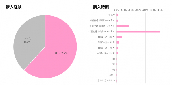 調査結果から、チャイルドシートの購入経験がある人は約62%であり、購入時期は妊娠後期が約60%と最も高いこと。また、購入時に実物を見に行った人は約86%と非常に高く、購入チャネルはベビー用品店が人気であることが分かった。