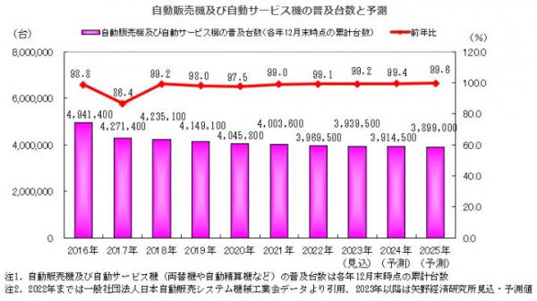 一般社団法人日本自動販売システム機械工業会によると、2022年末時点の自動販売機(以下、自販機)及び自動サービス機(両替機や自動精算機など)の普及台数は、前年比99.1%の396万9,500台と、400万台を下回った。2014年以降は減少傾向で推移しており、既存の自販機の設置ロケーション(設置場所)はアウトドア(屋外)・インドア(屋内)ともに飽和状態にあることや、新規の設置ロケーションがとくにインドアに限られてきていることから、この傾向は当面変わらないものと推察する。