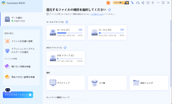 また、接続エラーの問題を処理する時、間違って必要なファイルを削除した場合は、データ復元ソフト「Tenorshare 4DDiG」を利用して、消えたデータをすぐに復元できるので、早速体験しましょう。