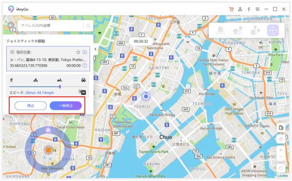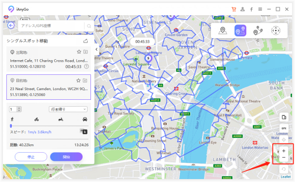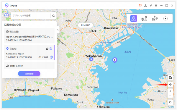 「位置情報の変更」モードで、好きな場所をマップ上に入力し、「変更開始」ボタンを押すだけで現在地を変更できます。