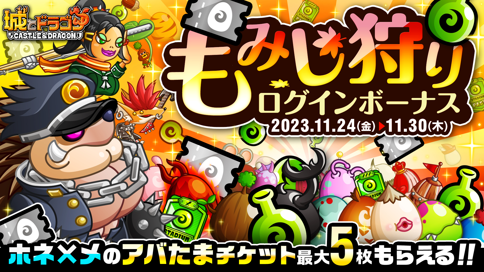 11月24日(金)より、ゲームにログインすると「ホネ×メのアバたまチケット」が最大5枚もらえる「もみじ狩りログインボーナス」を開催します。さらに、友トレ玉満タン回復などもプレゼント!報酬は期間中1日1回、最大7日間プレゼントされます。