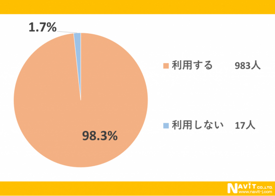 100円ショップを利用しますか?という問いに対して、「利用する」という回答が98.3%にも及びました。地域的に100円ショップがないというロケーションにお住まいの方以外は、ほとんどの方が利用しているのでしょうか。