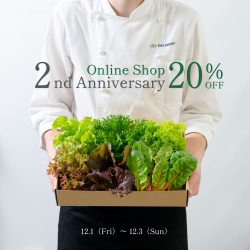 野菜の生産・販売事業を展開する、GG.SUPPLY株式会社 (本社:福岡県中央区、代表取締役:國村 隼太)の運営する、都会のHATAKE『GG.SUPPLY(ジージーサプライ)』は、2023年12月1日(金)~12月3日(日)の期間中、2周年記念に伴い公式オンラインショップにて20%OFFを実施致します。