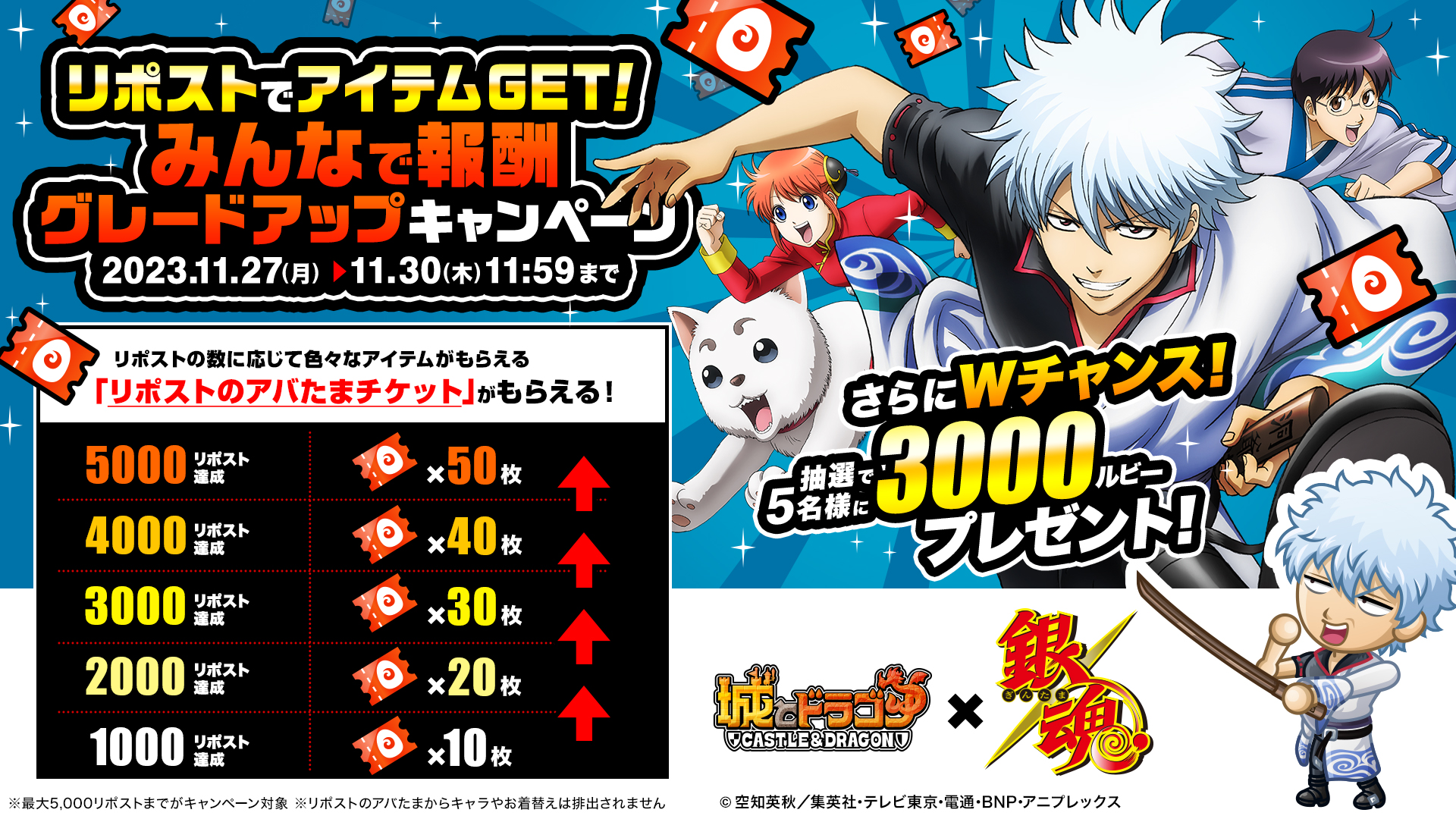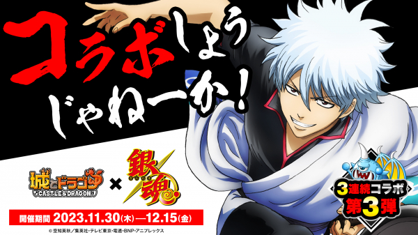 11月30日(木)より『城とドラゴン』にて、3連続コラボの第3弾としてTVアニメ『銀魂』との初のコラボイベントを開催することが決定いたしました。コラボ限定キャラとして「坂田銀時」が『城とドラゴン』に登場するほか、11月27日(月)からは「リポストでアイテムGET!みんなで報酬グレードアップキャンペーン」、11月28日(火)からは「コラボ開催記念!サイン色紙プレゼントキャンペーン」がスタートいたします。この機会をお見逃しなく!