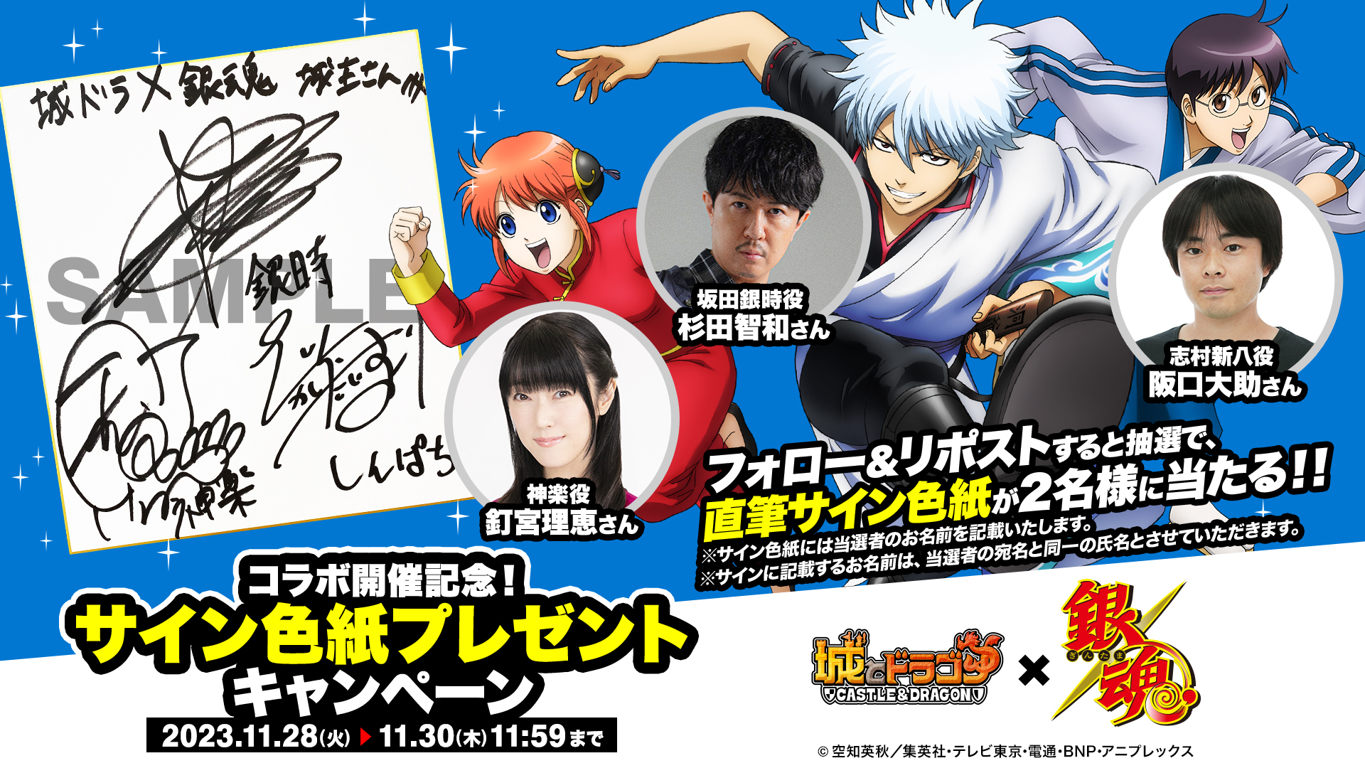 11月28日(火)より、コラボ開催を記念した「コラボ開催記念!サイン色紙プレゼントキャンペーン」を実施いたします。『城とドラゴン』公式X(旧Twitter)アカウントをフォローし、対象ポストをリポストしていただいた方の中から抽選で、杉田智和さん(坂田銀時役)、阪口大助さん(志村新八役)、釘宮理恵さん(神楽役)の直筆サイン色紙を2名様にプレゼントいたします。