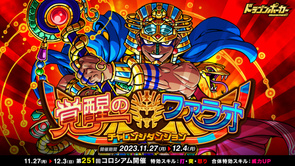 株式会社アソビズム(本社:東京都千代田区、代表取締役:大手智之)は、App Store・Google Playにて好評配信中のリアルタイム合体カードバトル『ドラゴンポーカー』で、2023年11月27日(月)より復刻チャレンジダンジョン「覚醒のファラオ」を開催いたします。