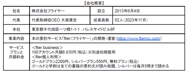 株式会社フライヤーは、本の要約サービス「flier(フライヤー)」を運営する、ITベンチャー(2013年6月設立)です。最大の特長は「書評(レビュー)」ではなく「要約」である点です。書き手の主観が入る書評とは異なり、著者の主張や論理(重要ポイントや全体像)を忠実にまとめ、読者に伝えます。書評でないため、出版社と著者から要約の許可を得る必要があり、要約した原稿にも目を通していただくことで、高品質なサービスを提供しています。