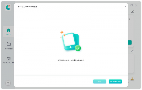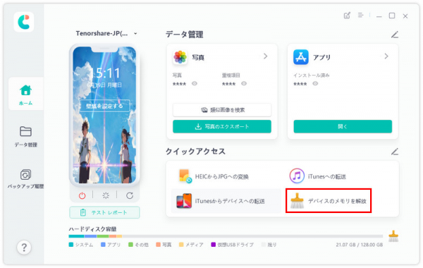 step1:iCareFoneをインストールして起動し、お使いのiPhone・iPod・iPadをアップル付属のUSBケーブルでPC/Macに接続します。「デバイスのメモリを解放」をクリックします。