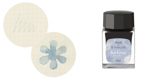 初雪をイメージし、新たに調色した限定アイスグレーです。淡い初雪を感じるブルーグレーで、ノートのクリーム色の中紙にもきれいに発色、色の濃淡が楽しめます。また、ラベルは初雪をイメージしたデザインにシルバーの箔押しがあしらわれています。使い切りやすく、かわいらしい20mlのミニボトル入りです。
