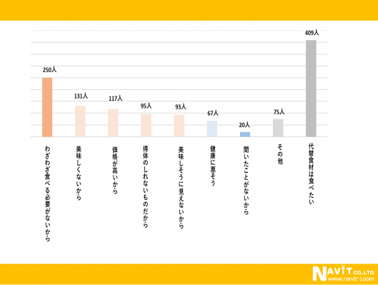 反対に、「代替食材を食べたくない理由は何ですか?」という質問を複数回答可で行ったところ、「わざわざ食べる必要がないから」が250人、「美味しくないから」が131人、「価格が高いから」が117人という順になりました。